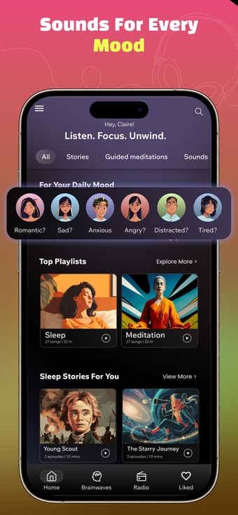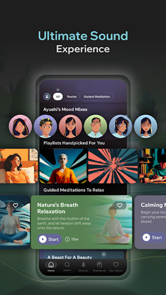 La biblioteca incluye una variedad de categorías para secciones específicas de sonidos de la naturaleza, melodías ambientales y pistas adaptadas a estados de ánimo específicos. Puedes usar el temporizador incorporado para establecer duraciones exactas para tus sesiones de escucha, lo cual es útil para cronometrar bloques de estudio o siestas cortas. Además, la aplicación cuenta con historias narradas para dormir que se reproducen junto con música suave de fondo para ayudarte a quedarte dormido.